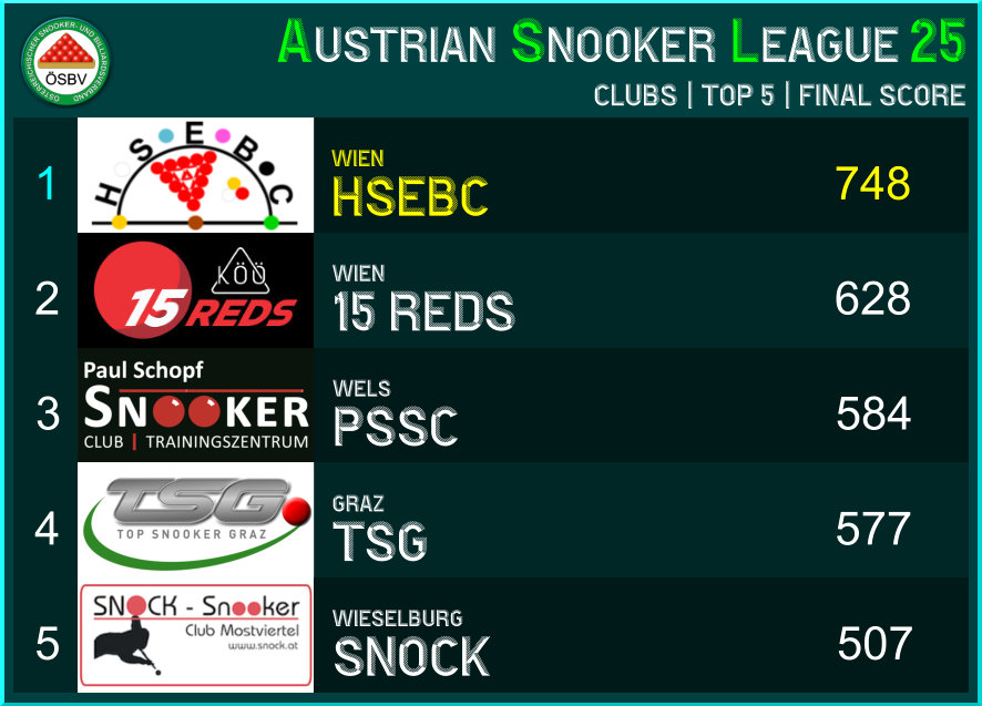 Christian Hochmayer (FBC) und Emanuel Stegmeier (ABC) haben Sonntag (12. 11.) beim TSG in Graz das 6. und letzte Austrian-Snooker-League-Doppel-Turnier der Saison überzeugend gewonnen. Dank des Turniersieges haben sie die Führung in der ASL-DOPPEL-RANGLISTE wieder übernommen und sind somit die jahresbeste Paarung geworden.